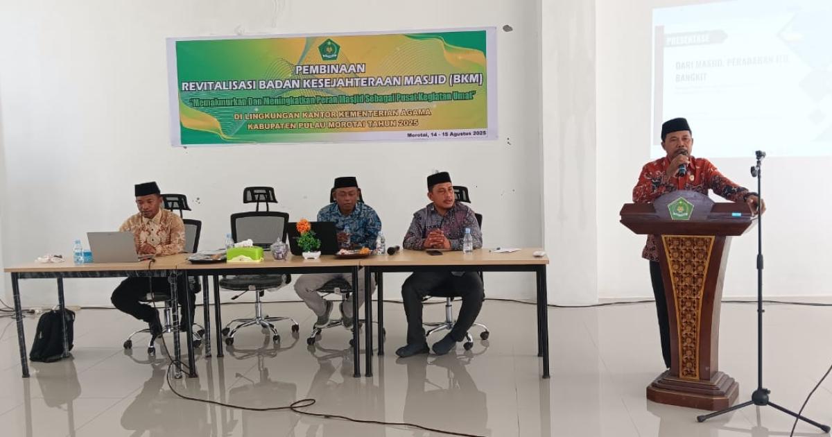 Morotai, Muhajirin Baru — (Humas kemenag Morotai) - Sebagai upaya memperkuat peran masjid sebagai pusat kegiatan umat serta mendorong pengelolaan masjid yang lebih profesional dan mandiri, Kantor Kementerian Agama (Kemenag) Kabupaten Pulau Morotai melalui Bimbingan Masyarakat Islam (Bimas Islam), menggelar Pembinaan Revitalisasi Badan Kesejahteraan Masjid (BKM) bertempat di lantai dua Pusat Layanan Haji dan Umrah Terpadu (PLHUT), Jumat (15/8/2025) pagi.