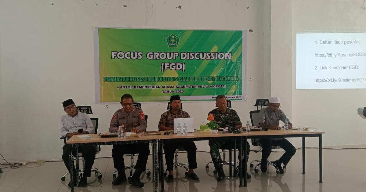 Morotai, Muhajirin Baru — (Humas Kemenag Morotai) Kantor Kementerian Agama (Kemenag) Kabupaten Pulau Morotai melalui Seksi Bimbingan Masyarakat Islam menggelar Focus Group Discussion (FGD) bertema “Penguatan Deteksi Dini Konflik Sosial Berdimensi Keagamaan” di Aula PLHUT, pada Sabtu (16/8/2025) pagi.