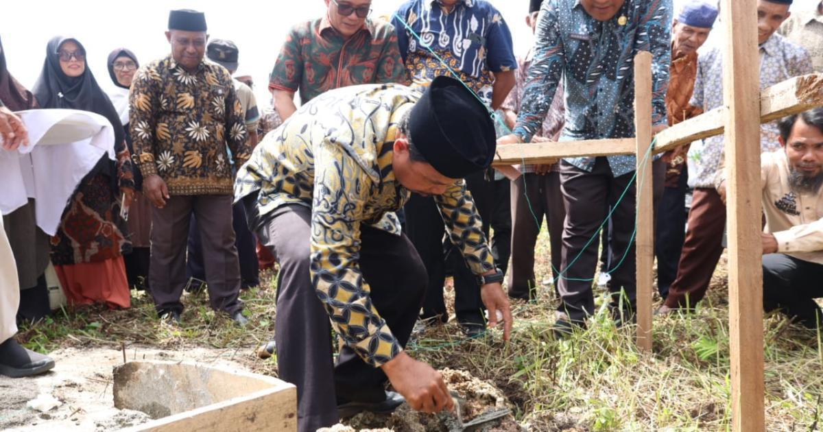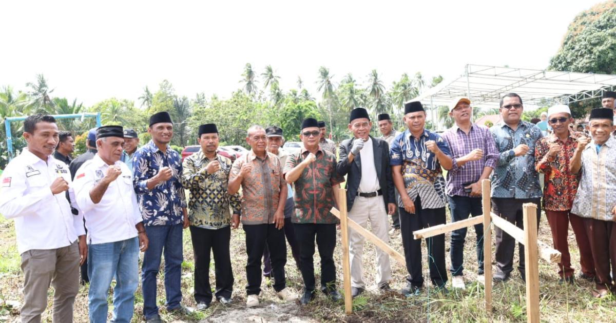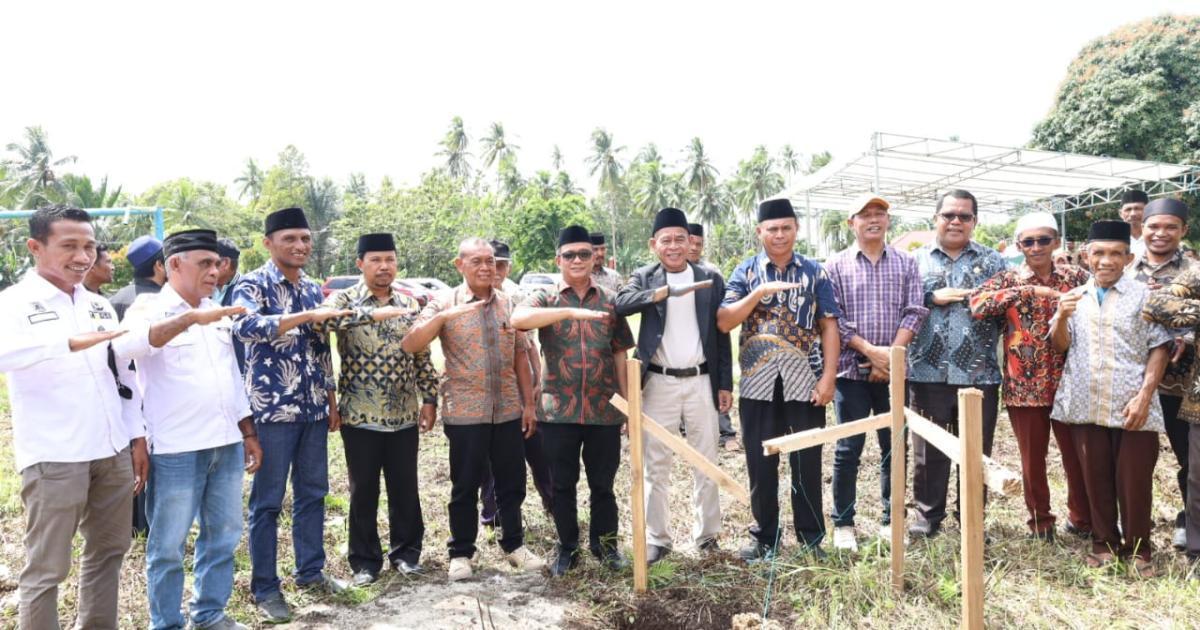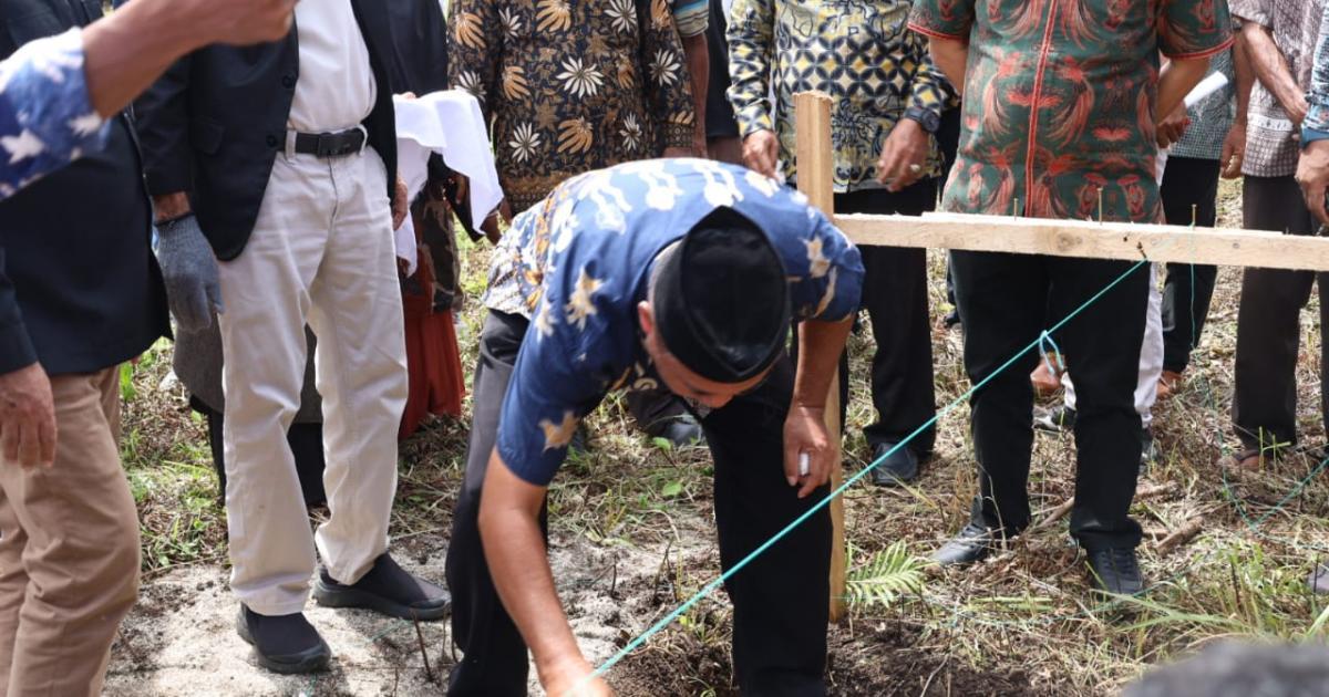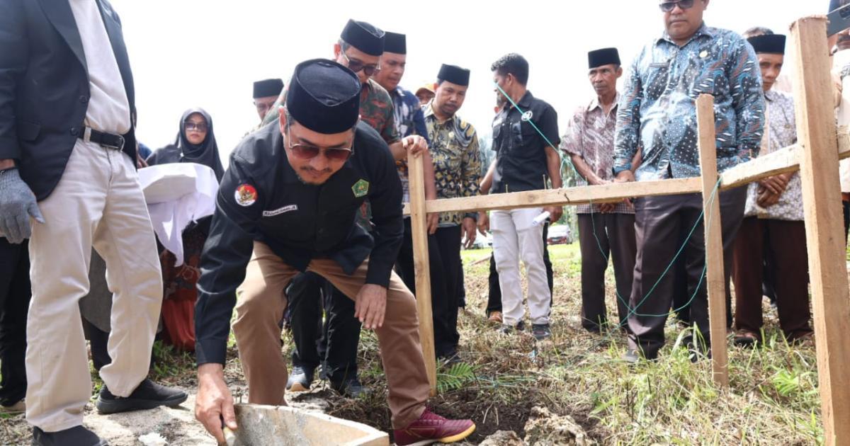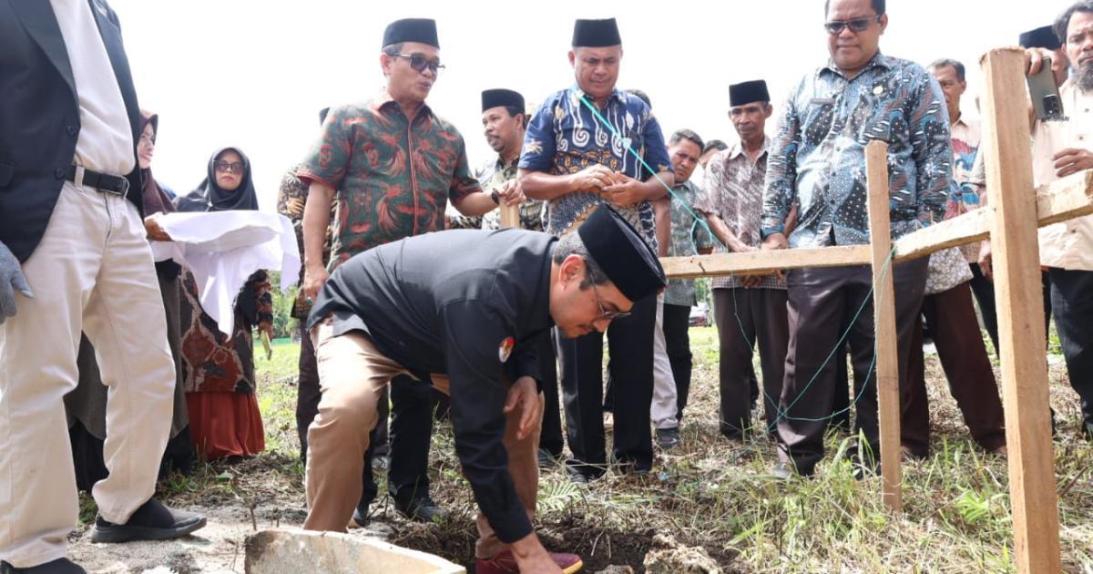 Morotai, Gamlamo - (Humas Kemenag Morotai) - Kepala Kantor Kementerian Agama Kabupaten Pulau Morotai, H. Abdurachman Assagaf, S.Ag., M.Pd.I, mendampingi Kepala Kantor Wilayah Kementerian Agama Provinsi Maluku Utara, Drs. H. Amar Manaf, M.Si, dalam kegiatan peletakan batu pertama pembangunan Kantor Urusan Agama (KUA) Kecamatan Morotai Timur yang berlokasi di Desa Gamlamo, Kamis (7/8/2025) pagi.
