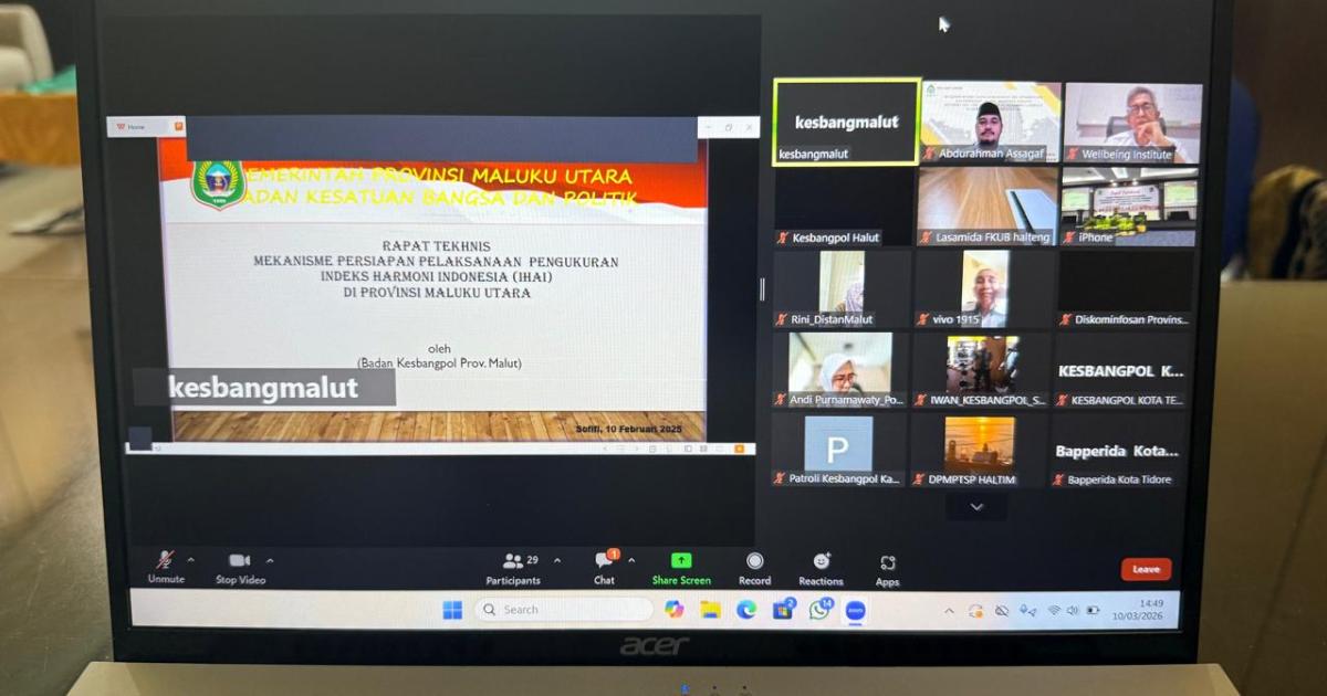 MOROTAI — (Humas Kemenag Morotai) — Kepala Kantor Kementerian Agama (Kakankemenag) Kabupaten Pulau Morotai, H. Abdurachman Assagaf, S.Ag., M.Pd.I, mengikuti Rapat Koordinasi Teknis Persiapan Mekanisme Pelaksanaan Pengukuran Indeks Harmoni Indonesia (IHaI) Tahun 2026 yang diselenggarakan oleh Badan Kesatuan Bangsa dan Politik (Kesbangpol) Provinsi Maluku Utara secara daring melalui Zoom Meeting, Selasa (10/3/2026).
