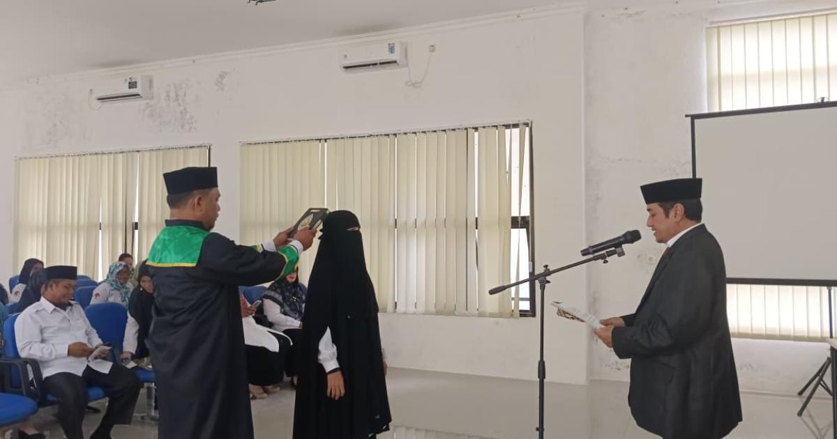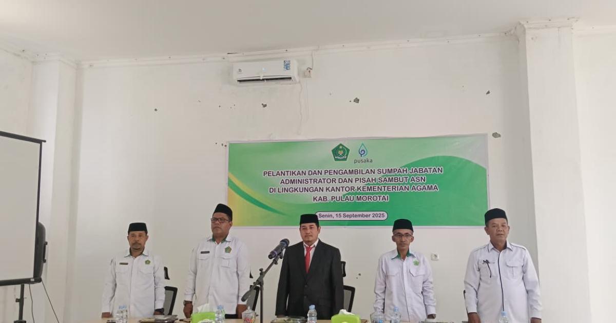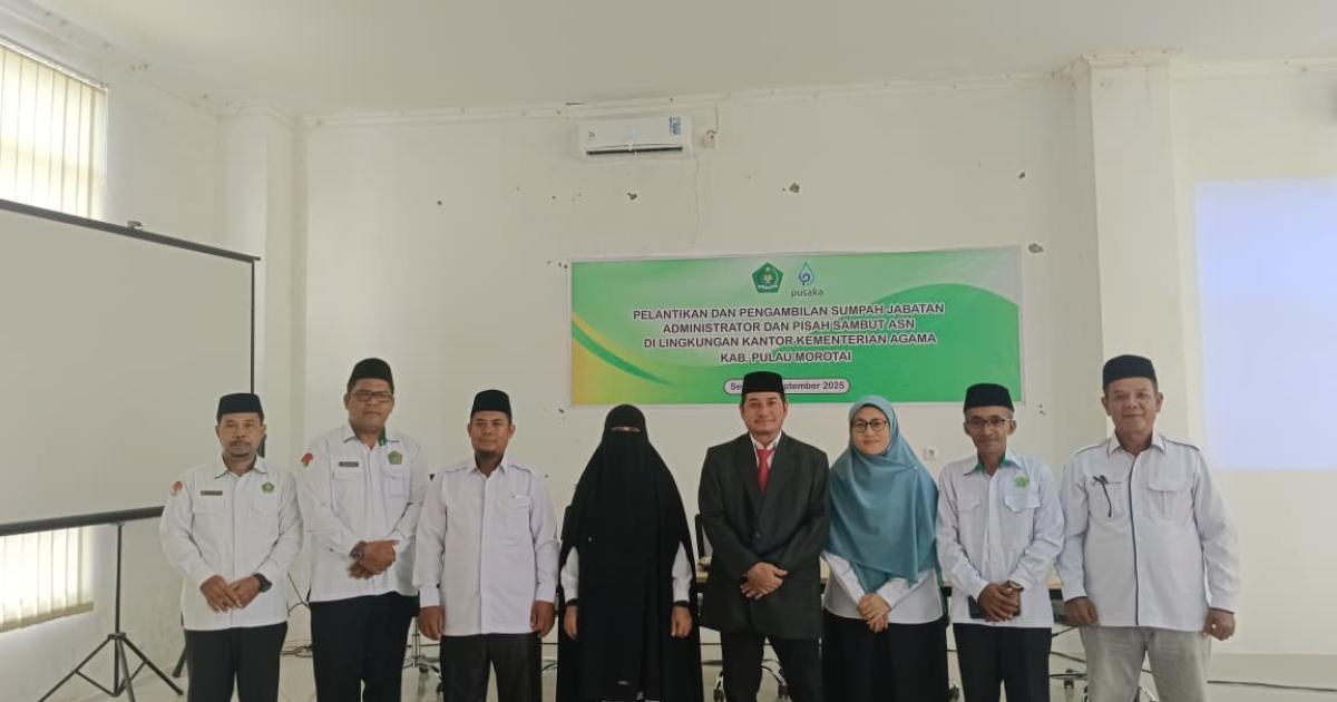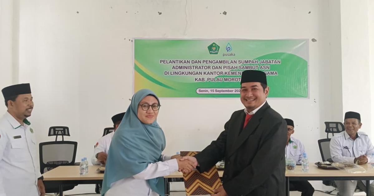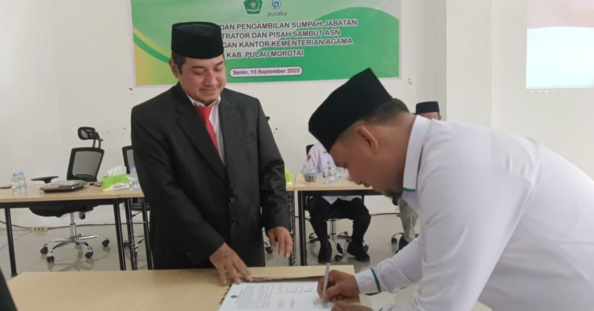 Morotai — (Humas Kemenag Morotai) — Kantor Kementerian Agama Kabupaten Pulau Morotai melantik dan mengambil sumpah jabatan administrator di Aula Gedung Penyelenggaraan Haji dan Umrah Terpadu (PLHUT), Senin (15/9/2025) pagi. Mariani S.Pd resmi menjabat sebagai Kepala Urusan Tata Usaha MTsN 1 Morotai setelah sebelumnya bertugas sebagai staf kepegawaian di Kantor Kemenag Morotai.
