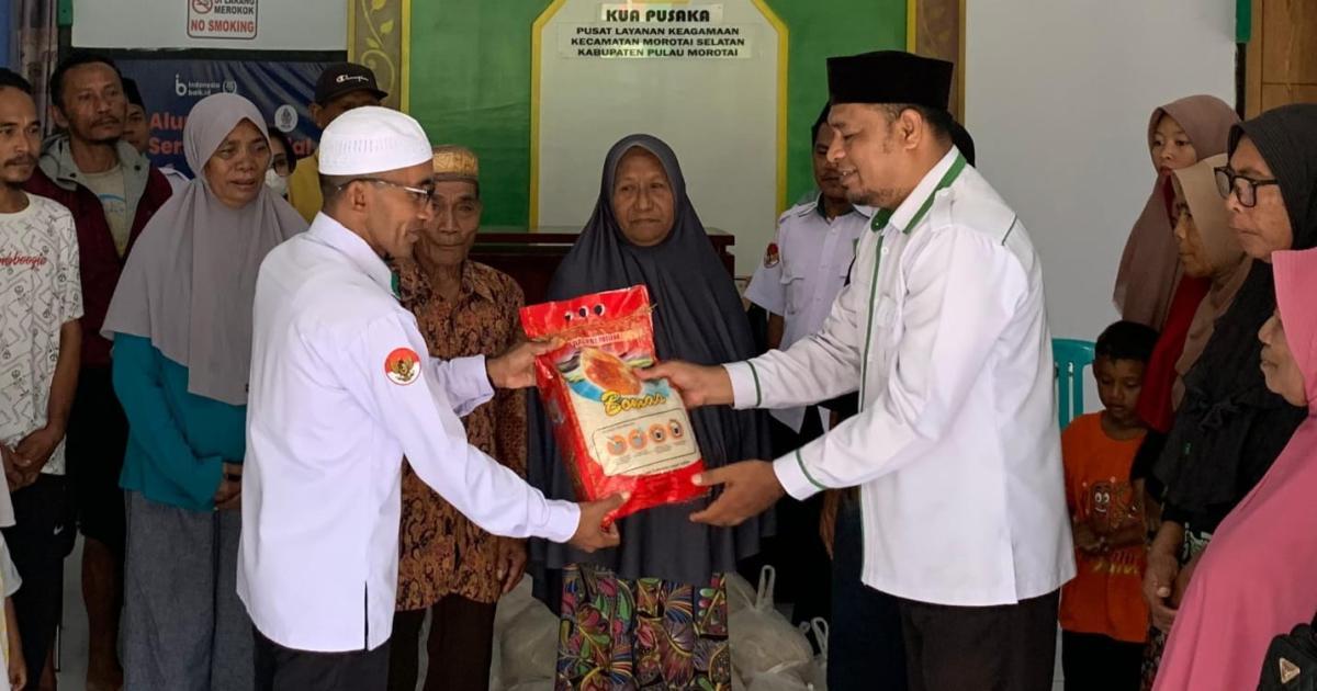 Penyerahan bantuan dilakukan secara langsung oleh Kepala Kantor Kementerian Agama Kabupaten Pulau Morotai, H. Abdurachman Assagaf, S.Ag., M.Pd.I, bersama Kepala Sub Bagian Tata Usaha Kemenag Morotai, H. Musanif Sibua, S.Ag., MM, kepada masyarakat yang berkumpul di Kantor KUA Morotai Selatan.